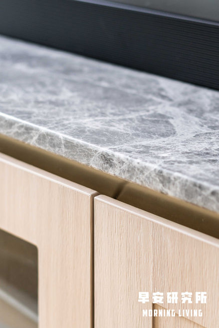 電視牆身選用了大理石紋膠板與金屬線條,將豐富的質感與奢華感巧妙結合。