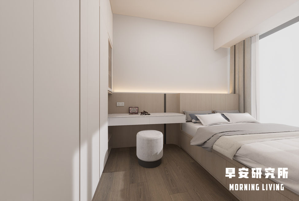 床頭飾板結合隱藏式燈槽,間接光源營造舒壓休息氛圍。設計緊貼牆身的化妝枱及收納櫃,細節實用兼具美感。